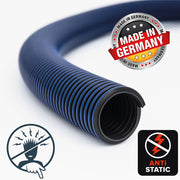 Disponible en diamètres internes de 25 mm et 32 mm, le tuyau HESD est compatible avec les manchons à vis DUST COMMANDER GC et GCx, ainsi qu'avec certains raccords Festool et Bosch. Son profil interne lisse assure une résistance minimale à l'écoulement de l'air, tandis que sa construction robuste garantit des performances durables même à des températures extrêmes (-50 °C à +60 °C).